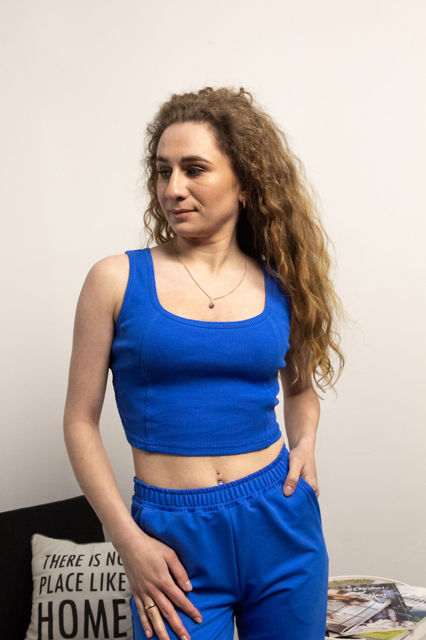 Жіночий топ пошитий із якісного трикотажу (рибани, виробленої з бавовни). Фактурна поверхня виходить завдяки чергуванню лицьових і виворітних петель. Після прання може давати зсідання, тому рекомендується прати за температури не більш ніж 30 градусів.